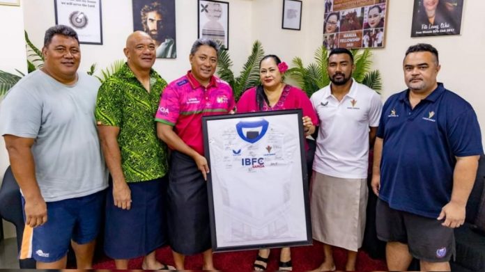 I ripoti a le Samoa Global na faailoa ai o le kamupani a le Samoa Stationery and Books na taulimaina e le pulega le afioga Tofilau Fiti Leung Wai ma le afioga Tuatagaloa Aumua Leung Wai se meaalofa faatauvaa a le Manu Samoa taitoafitu e faafetaia ai le lagolago a lenei kamupani i soo se fuafuaga a le ‘au.