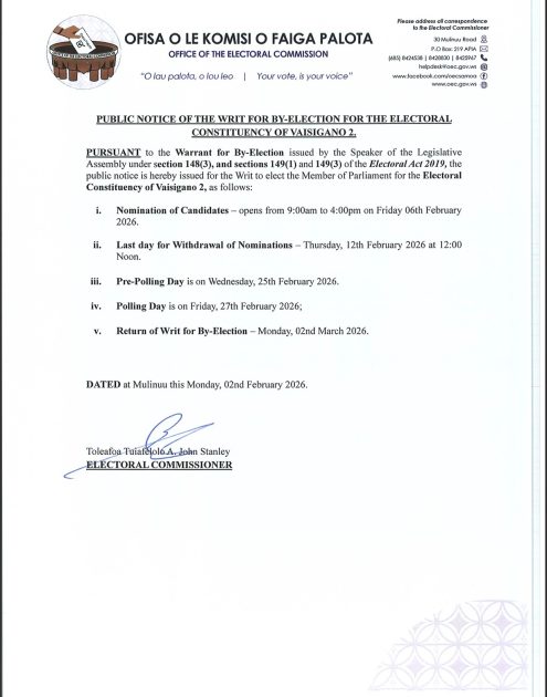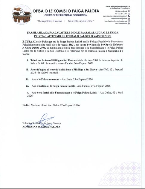 O faasilasilaga faalaua’itele e lua ua tuuina mai e le Komesina o faigāpalota le afioga Toleafoa Tuiafelolo Alexander John Stanley o loo faailoa ai o Safata 1 ma Vaisigano 2 o le a faatino a la faigāpalota laiti i le Aso Faraile 27 o le masina nei o Fepuari.