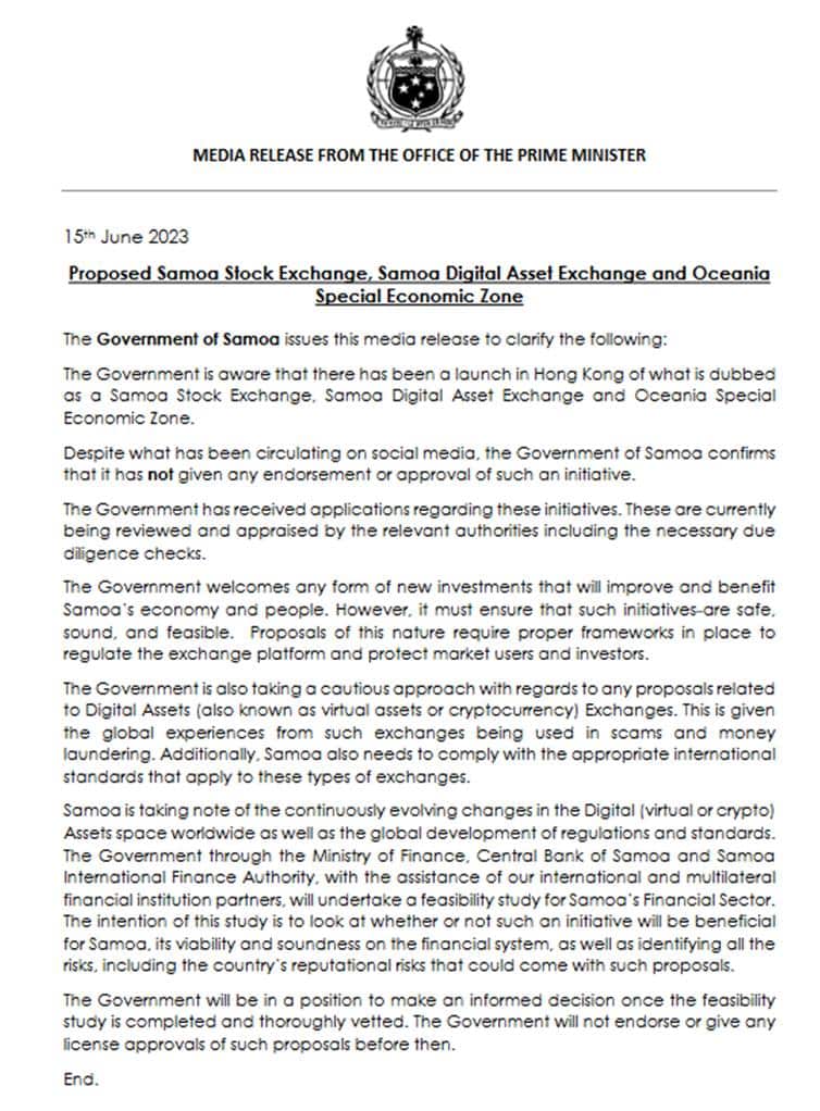 Ua faailoa ai foi e le Malo, e leai se ioega ua faamatuu atu i se gaioiga ua faalauiloa ai i Hong Kong i Saina ni auaunaga tau pisinisi ua ta’ua o le Samoa Stock Exchange, Samoa Digital Asset Exchange and Oceania Special Economic Zone.