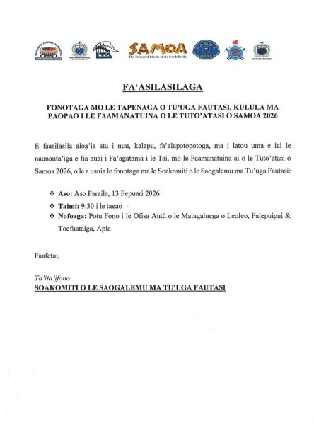 O le ulua’i vaiaso o le masina lona lua lenei o Fepuari 2026 ua faailoa ai e le ofisa sooupu o le malo le tauaao ai e le afioga i le Ao Mamalu o le Malo le afioga Tuimalealiifano Vaaletoa Sualauvi II o tusi tofiga taualoa, o le sui o le malo o Papua Niu […]