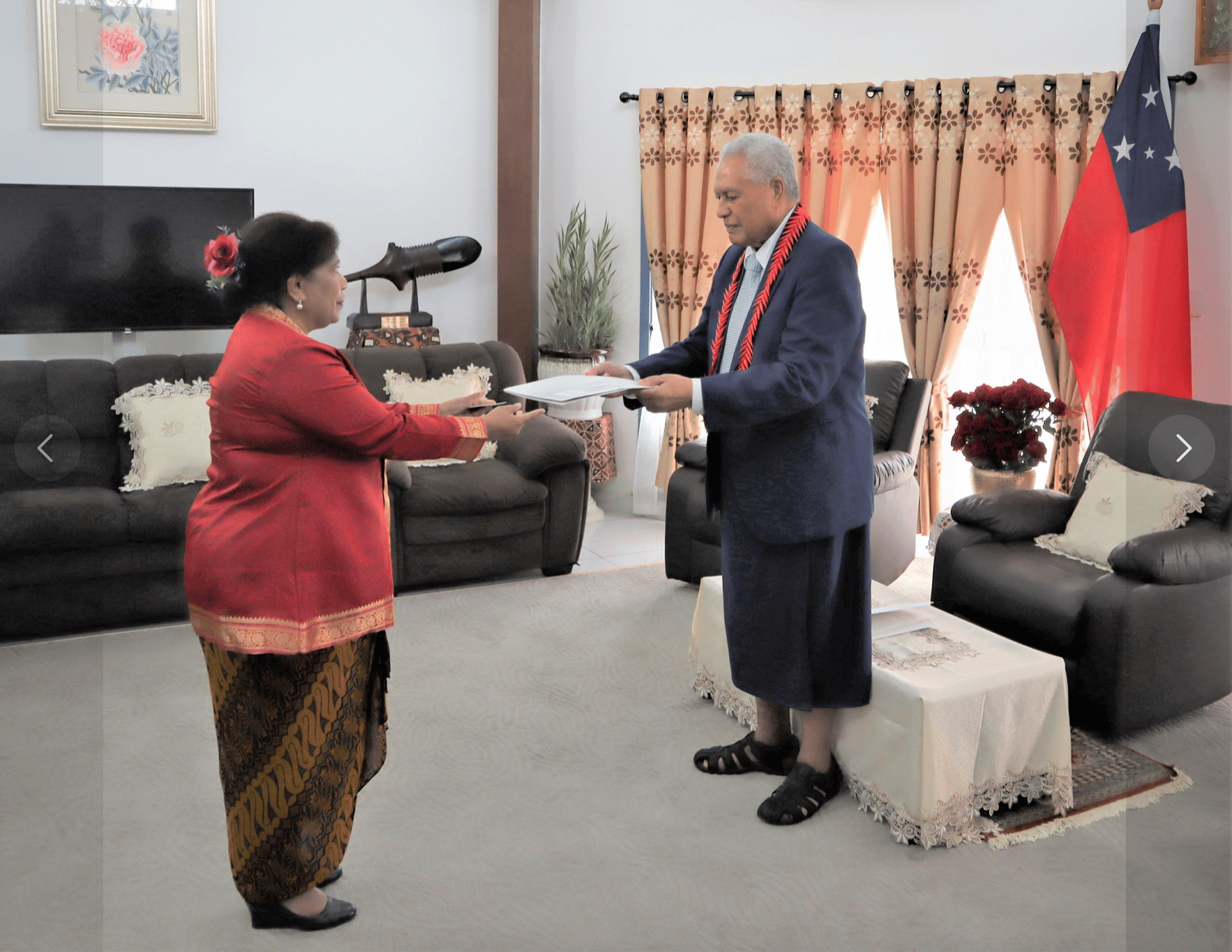 O le sauniga foi lea i le maota faalemalo o le afioga i le Ao Mamalu o le Malo afioga Tuimalealiifano Vaaletoa Sualauvi II ma lana masiofo, na momoli ai le faafetai a le Ao Mamalu o le Malo i le taitai o Indonesia e ala atu i lona amepasa filifilia fou mo lo tatou atunuu.